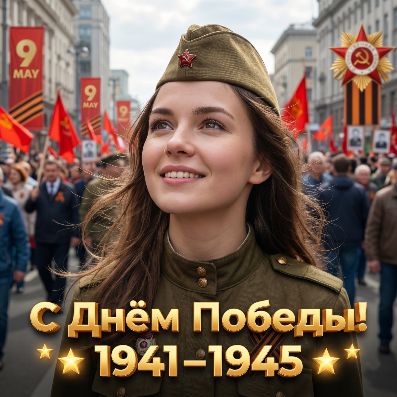 NanoBanana ProИспользуй лица загруженных фотографий как референсные, фотореалистичный портрет молодой женщины на праздничном шествии ко Дню Победы, вдохновлённый и светлый взгляд направлен вверх, мягкая улыбка, естественный макияж, длинные волосы, слегка развевающиеся на ветру, на голове военная пилотка с красной звездой, оливково-зелёная куртка в стиле военной формы, атмосфера массового городского праздника, вокруг люди с красными флагами и символикой Победы, фон — улица большого города с праздничной толпой и мягко размытыми зданиями, яркое дневное освещение, насыщенные красные акценты флагов, кинематографичная глубина резкости, лёгкое боке, реалистичные текстуры кожи и ткани, вертикальная композиция, портрет по грудь, динамичная атмосфера шествия, тёплая цветовая палитра, ощущение надежды и памяти, высокая детализация, профессиональная фотография, ультрадетализированный фотореализм, качество 8K, в нижней части изображения декоративная надпись «С Днём Победы! 1941–1945» крупным золотистым шрифтом с лёгким объёмным эффектом и небольшими светящимися звёздочками вокруг текста.