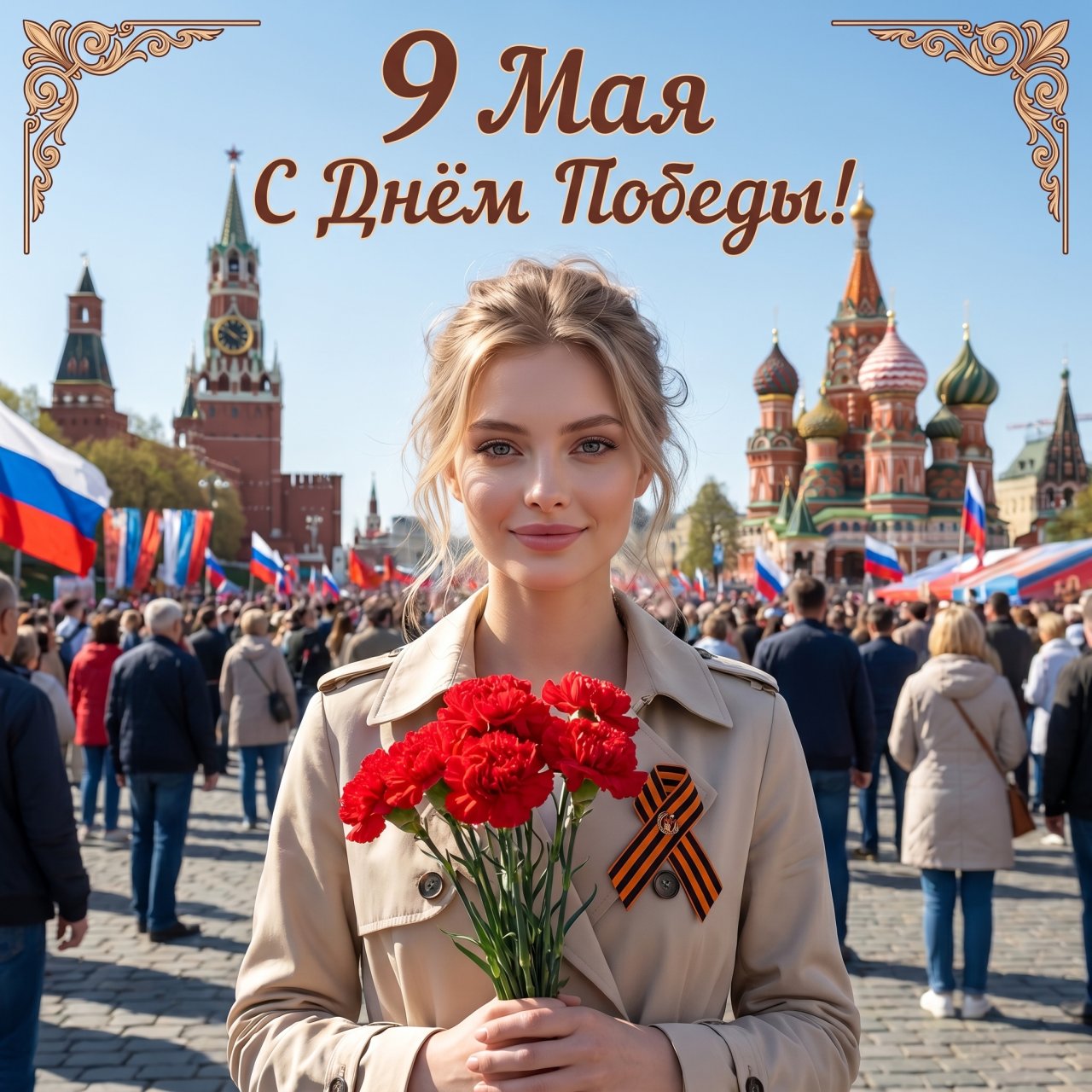 NanoBanana ProИспользуй лица загруженных фотографий как референсные, фотореалистичная молодая женщина с мягкой улыбкой стоит на Красной площади в Москве во время празднования Дня Победы, светлая кожа, натуральный макияж, волосы собраны в лёгкую небрежную причёску с выбившимися прядями, на ней светлый бежевый тренчкот, на груди закреплена георгиевская лента, в руках букет ярко-красных гвоздик, поза расслабленная, взгляд направлен в камеру, фон — многолюдная праздничная площадь с людьми, флагами России и праздничной символикой, на заднем плане видны башни Московского Кремля и храм Василия Блаженного, ясное голубое небо, дневное солнечное освещение, атмосфера торжественного патриотического праздника, реалистичная городская сцена, высокая детализация лиц и одежды, кинематографичная глубина резкости, естественные цвета, мягкое боке на фоне, вертикальная композиция, портрет в полный рост, профессиональная фотография, ультрадетализированная текстура ткани, реалистичные тени и свет, качество 8K, праздничная открытка с крупной надписью «9 Мая С Днём Победы!» в верхней части кадра, декоративные орнаменты вокруг текста, гармоничный дизайн поздравительного постера.