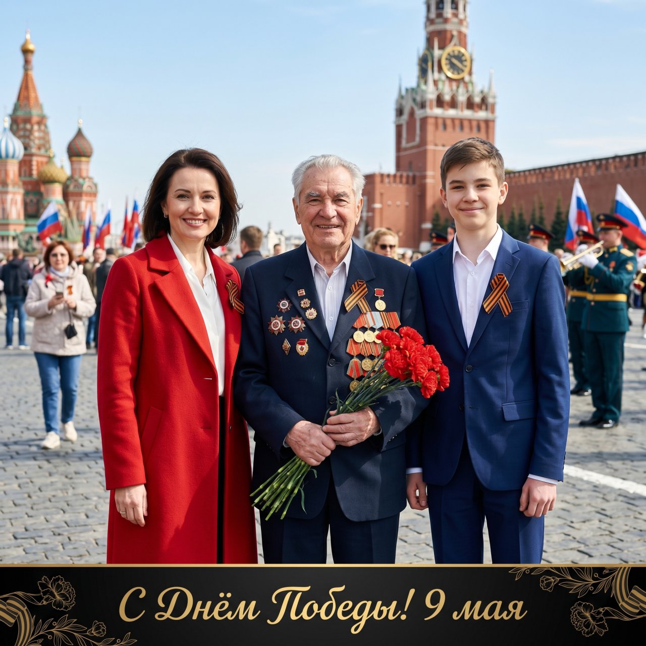 NanoBanana ProИспользуй лица загруженных фотографий как референсные, фотореалистичная семейная сцена на Красной площади в Москве во время празднования Дня Победы, пожилой мужчина-ветеран с седыми волосами стоит рядом с женщиной и подростком, все смотрят в камеру и улыбаются, ветеран одет в тёмный классический костюм с множеством орденов и медалей, в руках держит букет красных гвоздик, на груди георгиевская лента, женщина в элегантном ярко-красном пальто с белой блузкой, аккуратная причёска, подросток в тёмно-синем классическом костюме, на груди у всех георгиевские ленты, фон — Красная площадь с людьми, праздничными флагами и торжественной атмосферой, на заднем плане Спасская башня Кремля и храм Василия Блаженного, ясное дневное небо, мягкий солнечный свет, реалистичные тени и естественная цветопередача, высокая детализация лиц, тканей и наград, кинематографичная глубина резкости, лёгкое размытие фона, вертикальная композиция, портрет в полный рост, профессиональная праздничная фотография, атмосфера памяти, семейного единства и уважения к ветеранам, насыщенные, но натуральные цвета, качество 8K, в нижней части кадра декоративная чёрная плашка с золотой надписью «С Днём Победы! 9 мая» и изящными орнаментами по бокам.