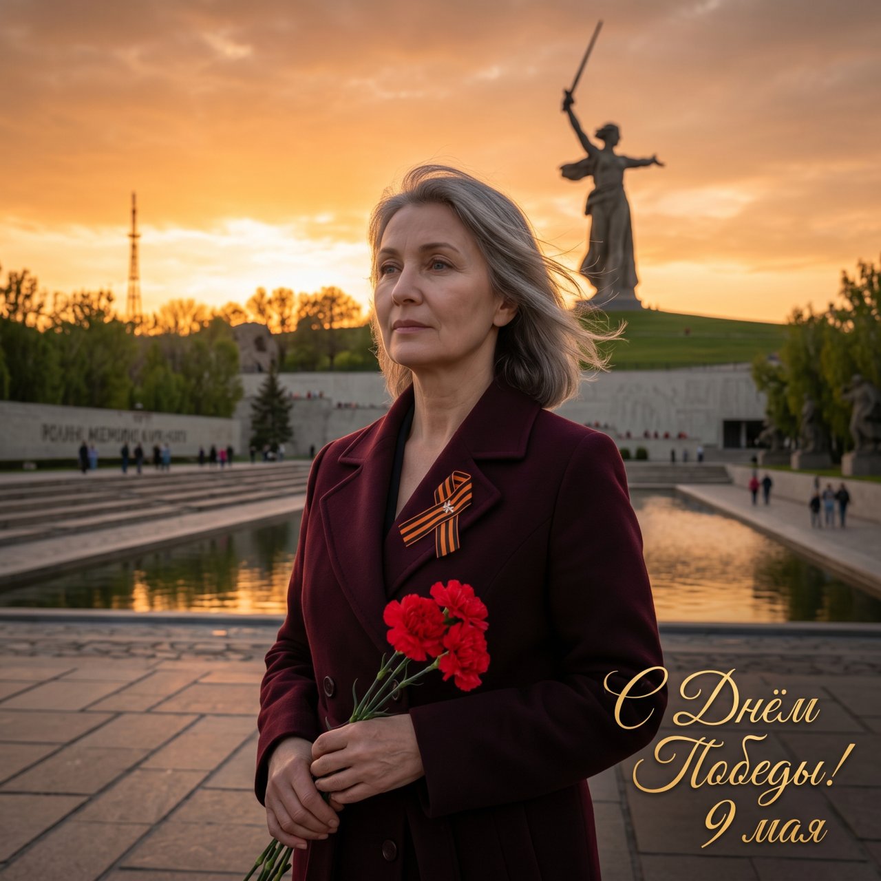 NanoBanana ProИспользуй лица загруженных фотографий как референсные, фотореалистичный портрет зрелой женщины, стоящей у мемориального комплекса на фоне монумента «Родина-мать зовёт!» в Волгограде во время заката, задумчивый и спокойный взгляд, седые волосы средней длины, слегка развевающиеся на ветру, на женщине элегантное тёмно-бордовое пальто, на груди закреплена георгиевская лента, в руках несколько ярко-красных гвоздик, атмосфера памяти, уважения и тихой скорби, фон — мемориальный парк с каменными аллеями, отражающими бассейнами и людьми вдалеке, величественная статуя на возвышенности, драматичное оранжево-золотое небо заката, мягкое тёплое освещение, кинематографичная глубина резкости, лёгкое размытие дальнего плана, реалистичные тени и световые отражения на лице и ткани, высокая детализация, профессиональная художественная фотография, вертикальная композиция, портрет по пояс, насыщенные тёплые цвета, атмосферный фотореализм, качество 8K, в нижней правой части изображения декоративная надпись «С Днём Победы! 9 мая» золотистым элегантным шрифтом с изящными орнаментами.