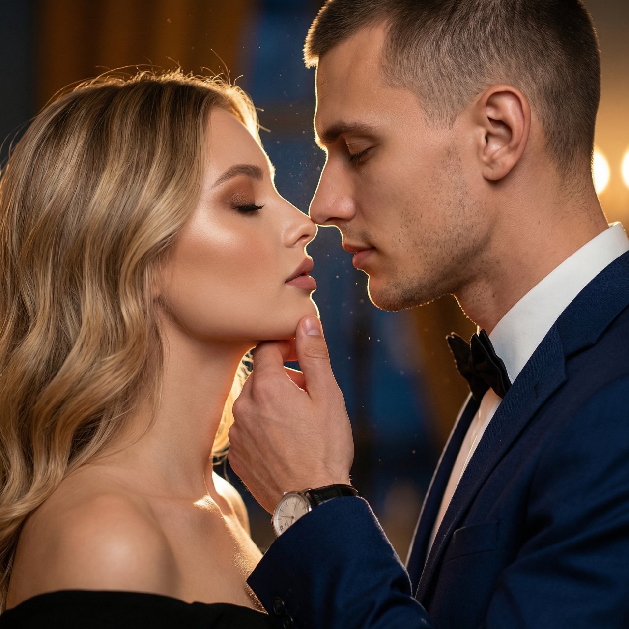 NanoBanana ProИспользуй лица мужчины и женщины с загруженных фото. Не меняй черты лиц. Сюжет и композиция: Мужчина и женщина сняты с лицами вплотную друг к другу. Мужчина держит женщину за подбородок пальцами, их губы почти соприкасаются, глаза закрыты, поза статичная. Кадр — крупный, от груди до макушек, снят на уровне глаз, композиция центрирована, лица расположены в профиль. Сохранение исходных черт лица обязательно. Внешность и детали женщины: Кожа: ровный теплый тон с выраженным сатиновым свечением на скулах и плечах. Макияж: акцент на глаза — мягко растушеванные тени в теплых коричнево-бронзовых тонах, длинные ресницы, тонкая подводка по линии ресниц, губы с матово-сатиновым финишем естественного розово-бежевого оттенка. Прическа: волосы уложены в мягкие свободные волны с боковым пробором, объем распределен по всей длине, пряди аккуратно обрамляют лицо. Одежда: черное платье с открытыми плечами из плотной матовой ткани без блеска. Внешность и детали мужчины: Одежда: пиджак темно-синего костюма, белая рубашка с классическим воротником, черная бабочка. На запястье — металлические часы с темным циферблатом и черным кожаным ремешком. Окружение и атмосфера: Интерьер с мягко освещенным фоном. Фон нейтральный, размытый, в воздухе видны мелкие световые частицы, создающие легкую дымку. Освещение: Теплое смешанное освещение. Основной мягкий свет расположен сбоку и немного позади пары, создавая контровой свет по контуру профилей и подчеркивая черты лиц. Дополнительный мягкий заполняющий свет спереди выравнивает тени. Контраст умеренно высокий, тени глубокие, блики на коже и волосах теплые и контролируемые. Технические параметры: Съемка на портретный объектив 85 мм. Малая глубина резкости: резкий фокус на лицах, передний план и фон мягко размыты. Текстура кожи и ткани в зоне фокуса проработаны с высокой детализацией. Постановочная романтическая портретная сцена, фотореалистичное исполнение. Цветовая гамма и стилистика: Романтическое кинематографичное настроение. Теплые янтарные и глубокие темно-синие тона. Мягкая золотистая цветовая температура. Умеренная насыщенность. Сильный контровой свет, мягкий фронтальный заполняющий свет, глубокие, но плавные тени, теплые светящиеся блики. Кремовое боке, напоминающее свечное освещение, легкая пленочная мягкость, люксовая кинематографичная цветокоррекция.