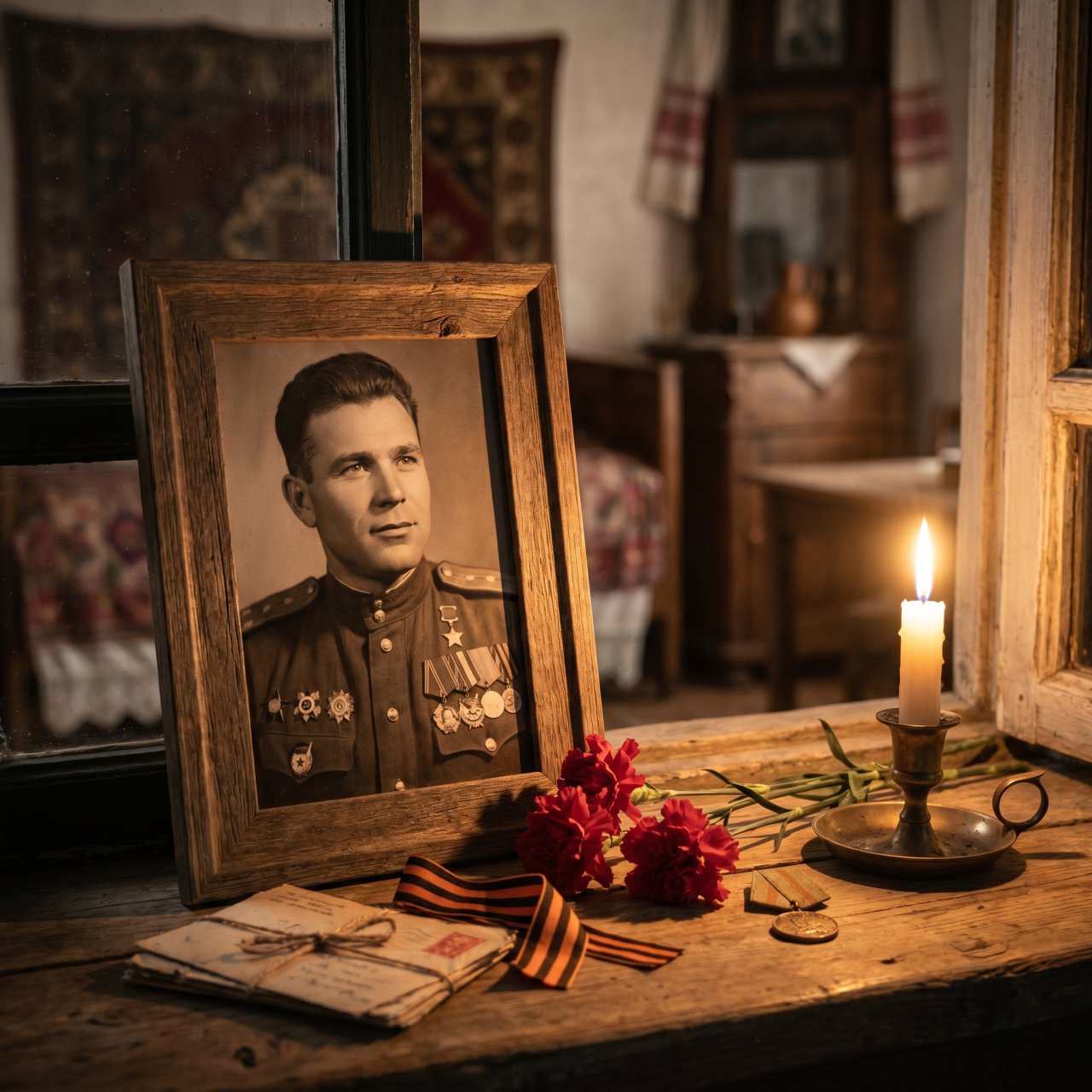 NanoBanana ProСцена максимально повторяла композицию, а лицо и внешность брались с загружаемого фото: «Фотореалистичная мемориальная сцена в винтажном стиле, тёплый приглушённый свет свечи, старая деревянная поверхность у окна, атмосфера памяти и истории. В центре — деревянная рамка с чёрно-белым портретом человека из загруженного фото, лицо полностью сохранено, высокая схожесть, естественные черты, реалистичная текстура кожи. Человек изображён в военной форме середины XX века с медалями и наградами, классический студийный портрет, взгляд слегка вверх и в сторону, уверенное спокойное выражение лица. Рядом с рамкой лежат красные гвоздики, старая георгиевская лента, винтажные письма и медаль на состаренной деревянной поверхности. Справа горящая свеча в металлическом подсвечнике, мягкий огонь создаёт тёплые блики и глубокие тени. Фон — тёмное старое деревянное окно и интерьер в ретро-стиле. Кинематографичная композиция, shallow depth of field, realistic lighting, ultra detailed, emotional memorial mood, historical atmosphere, highly realistic textures, soft candle glow, dramatic shadows, 8k, photorealistic, vintage color grading, documentary style photography.» Для лучшего совпадения можно добавить в конец: «Use uploaded face reference with maximum likeness, preserve identity, facial proportions, hairstyle and expression from source photo.»