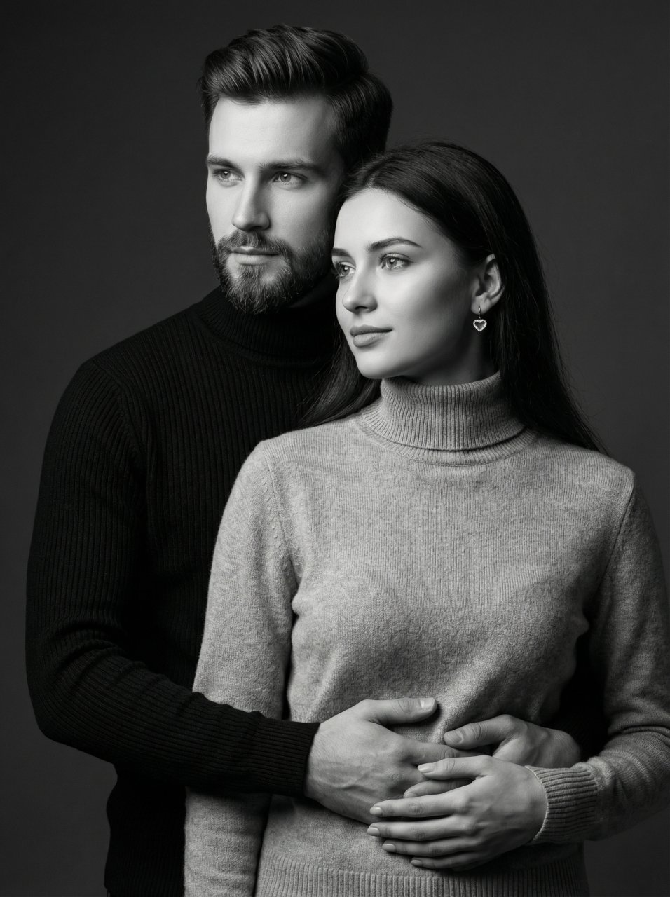 NanoBanana ProИспользуй лица мужчины и девушки с загруженных фото. Черты лица не менять. Художественный студийный портрет молодой пары в классической черно-белой эстетике. Мужчина с аккуратной бородой и стильной укладкой стоит сзади, нежно обнимая женщину за талию. На нем черный облегающий бадлон с ребристой текстурой. Женщина с длинными прямыми волосами и выразительными чертами слегка повернула голову в сторону — взгляд мечтательный, спокойный. Она в светлом кашемировом свитере с воротником-поло и такой же мелкоребристой текстурой. Глубокая монохромная палитра с богатым диапазоном серых тонов. Драматичный, но мягкий боковой свет (кьяроскуро) подчеркивает контуры лиц, атлетичное телосложение мужчины и фактуру трикотажа. Фон темно-серый, минималистичный, создает ощущение глубины. Детали: изящные серьги-сердечки у женщины. Руки мужчины сцеплены на ее животе — жест защищенности и нежности. Безупречный маникюр, естественный макияж, идеальные линии бровей. Фотореализм, высокая детализация нитей свитера и кожи. Эстетика Vogue, кинематографичная композиция, 8K, резкий фокус на лицах.