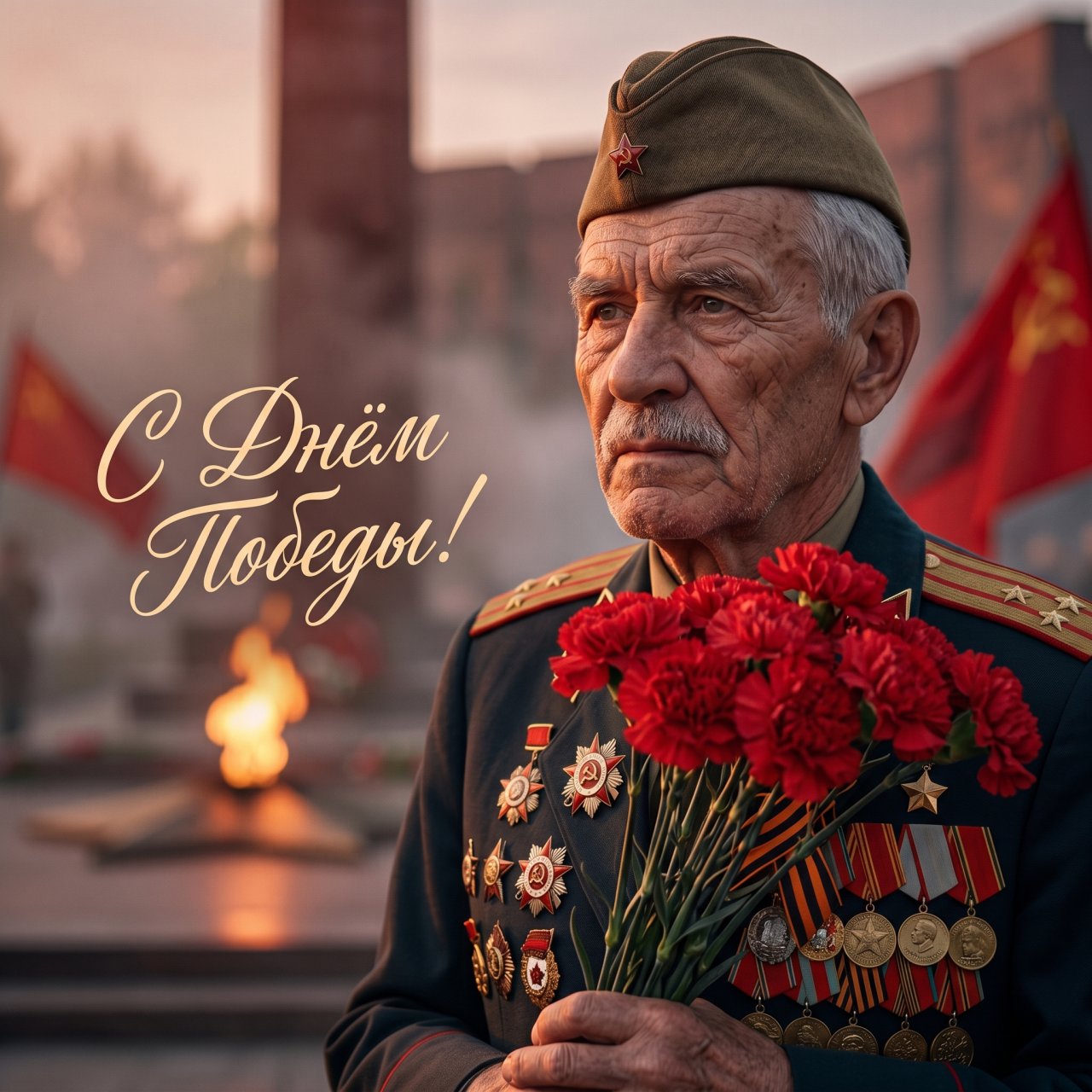 NanoBanana ProИспользуй лица загруженных фотографий как референсные, фотореалистичный портрет пожилого ветерана Великой Отечественной войны крупным планом, выразительное лицо с глубокими морщинами, седые волосы и усы, серьёзный и задумчивый взгляд, направленный вдаль, на голове старая военная пилотка с красной звездой, тёмная парадная форма с множеством орденов, медалей и георгиевской лентой на груди, в руках большой букет ярко-красных гвоздик, фон — мемориальный комплекс с Вечным огнём и мягко размытыми знаменами, тёплое вечернее освещение, золотисто-красная палитра, драматичная атмосфера памяти и уважения, кинематографичная глубина резкости, реалистичные текстуры кожи, ткани и металла наград, мягкое боке, лёгкая дымка, вертикальная композиция, портрет по грудь, художественная постановочная фотография, высокая детализация, атмосферный фотореализм, качество 8K, в левой части изображения каллиграфическая надпись «С Днём Победы!» светлым элегантным шрифтом.