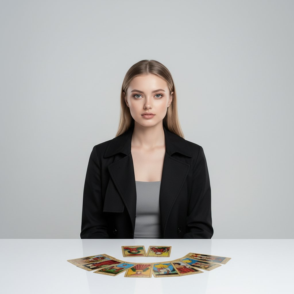 Девушка в лаконичном сером платье и черном минималистичном плаще расположилась за белым столом. Перед ней веером разложены несколько карт Таро. Она смотрит прямо в объектив, окруженная чистым, светлым пространством, создающим атмосферу мистики.