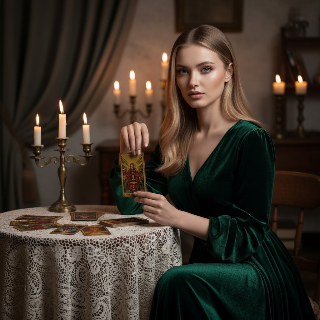 Женщина в струящемся бархатном платье изумрудного оттенка расположилась за столиком, накрытым кружевной тканью. Перед ней лежат карты Таро, одно из которых она держит в руке, пристально глядя в объектив. Комнату окутывает мягкий полумрак, освещаемый мерцанием свечей, расположенных позади.