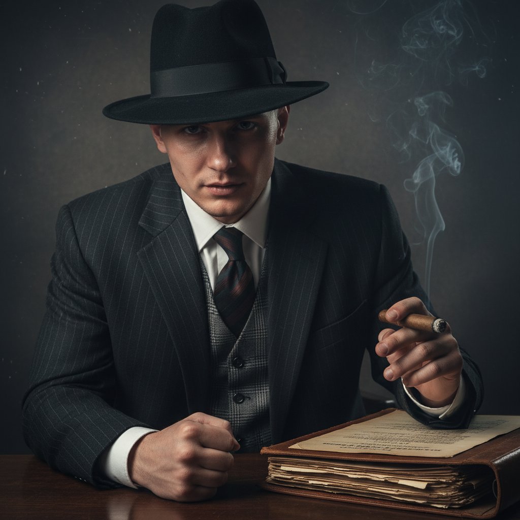 Мужчина в графитовом костюме гангстера эпохи 1920-х, жилет в мелкую клетку, белая рубашка, шелковый галстук, темная шляпа-федора. Он наклонен вперед, одна рука сжата в кулак и опирается на старую папку с документами, в другой руке дымится массивная сигара. Крупный план, взгляд направлен прямо в объектив.