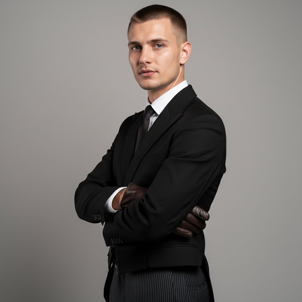 Мужчина в черном винтажном костюме в стиле 1920-х годов: удлиненный пиджак, полосатые брюки, белая рубашка, шелковый галстук, темные кожаные перчатки. Вид вполоборота, взгляд через плечо направлен в объектив, руки скрещены на груди, крупный план.