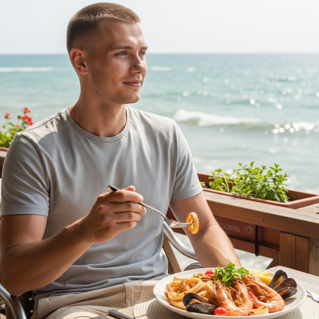 Мужчина в летней одежде (футболка, шорты) расслабленно сидит в прибрежном кафе. В руке он держит вилку, направляя ее к аппетитной тарелке с дарами моря. Его взгляд устремлен вдаль, на лице легкая улыбка. На заднем плане видны элементы террасы и морские волны. Снимок крупным планом, передающий наслаждение едой.