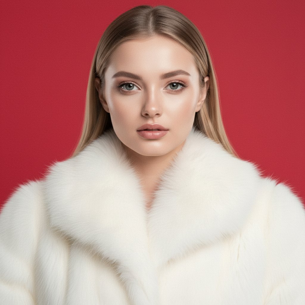 Портрет женщины в студии на алом фоне, одетой в элегантную белую шубу с пышным воротником из пушистого меха. Снято на среднем плане, модель смотрит прямо в объектив с уверенным выражением лица. Волосы распущены, макияж выполнен в стиле гламур. Ощущение винтажной модной фотосессии из ретро-журнала.