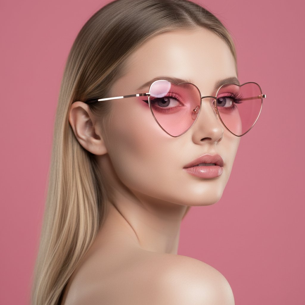 Крупный план, ультрареалистичный портрет 8K. Девушка смотрит через плечо, создавая загадочный образ. На ней очки в форме сердца с розовыми линзами, отражающими свет. Выразительные розовые тени на веках, драматичные черные стрелки, длинные пушистые ресницы и нежные розовые губы. Кожа с перламутровым сиянием придает образу гламурный вид. Фон — насыщенный розовый, гармонирующий с образом. Модный, потрясающий, настоящий шедевр.