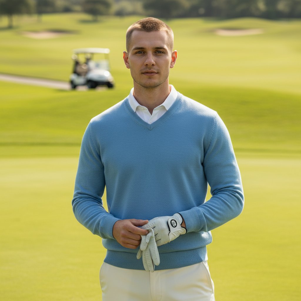 Мужчина с короткой стрижкой и легкой небритостью позирует на поле для гольфа. За ним — ухоженная зеленая трава и гольф-кар. Одет в светло-голубой джемпер с V-образным воротом, надетый поверх белой рубашки, и брюки кремового цвета. В руке держит перчатку для гольфа, взгляд направлен в объектив. Средний план.