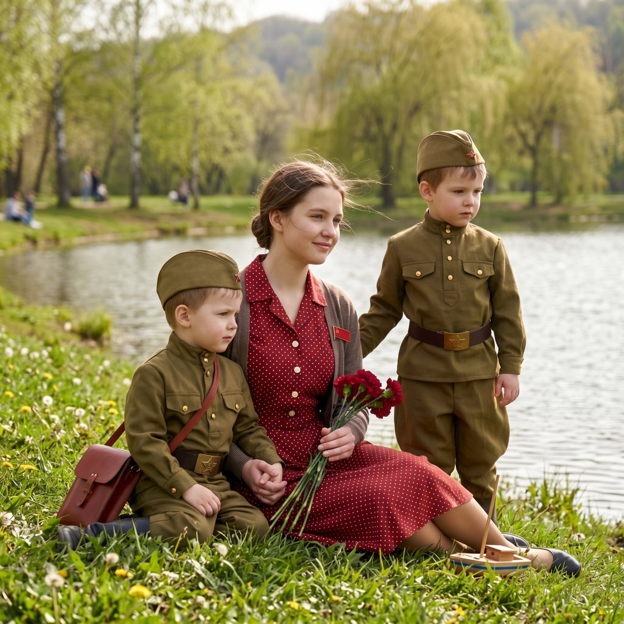 NanoBanana ProИспользуй лица загруженных фотографий как референсные, фотореалистичная семейная сцена на природе у тихого озера, молодая женщина в винтажном красном платье в белый горошек сидит на траве, мягко улыбаясь, рядом двое маленьких детей в стилизованной советской военной форме времён Великой Отечественной войны, мальчики в пилотках с красными звёздами и ремнями, один ребёнок стоит рядом, второй слегка прислонился к матери, у женщины в руках несколько ярко-красных гвоздик, атмосфера памяти поколений и семейного уважения к истории, фон — спокойный природный пейзаж с водой, весенними деревьями и мягко размытым берегом, естественное дневное освещение, тёплая приглушённая цветовая палитра, кинематографичная глубина резкости, мягкое боке, реалистичные текстуры ткани, травы и кожи, композиция на уровне глаз, гармоничная семейная поза, спокойная и трогательная атмосфера, лёгкий ветер в волосах, высокая детализация, художественный фотореализм, вертикальная композиция, качество 8K, акцент на семейной близости, символике памяти и весеннем настроении.