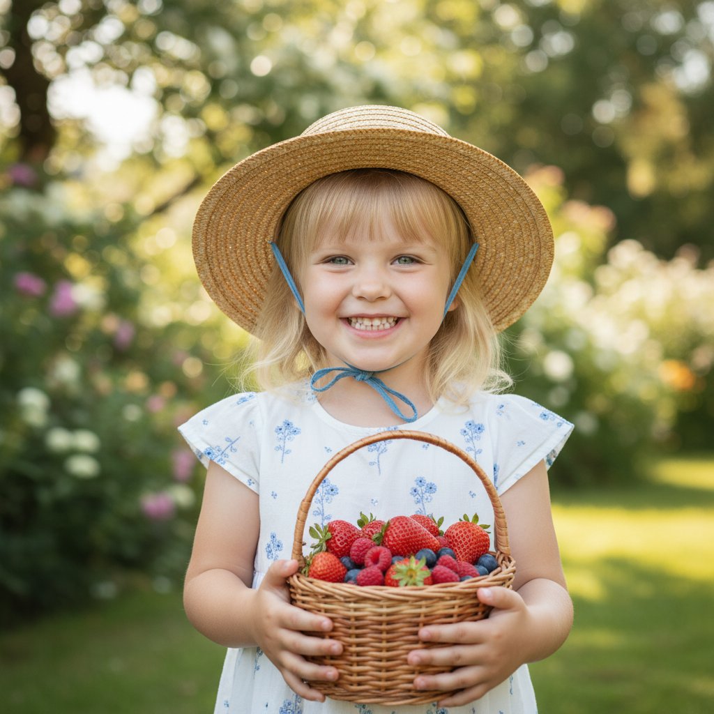 Портрет ребенка в легком летнем наряде и шляпе из соломы, держащего полную корзинку спелых ягод. Девочка радостно улыбается, глядя прямо в объектив. На заднем плане — живописный сад в летний день. Фокус на крупном плане, передающий атмосферу деревенской идиллии и беззаботного счастья.