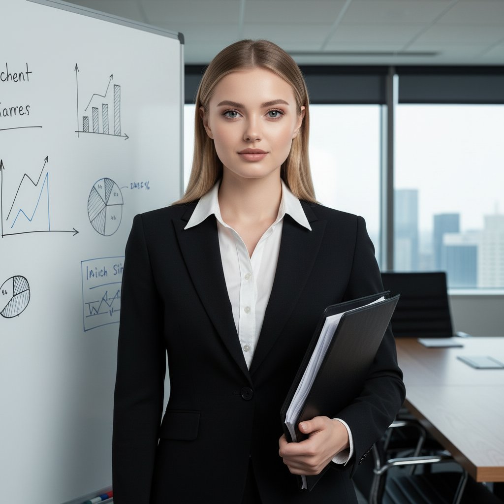 Профессиональный портрет женщины-юриста в строгом деловом костюме (черный жакет, белая блузка). Она стоит перед белой доской, на которой изображены графики, и держит в руках папку с документами. Взгляд направлен в объектив. На заднем плане видна переговорная комната. Фотография выполнена в крупном плане, подчеркивая деловую атмосферу и строгий стиль.