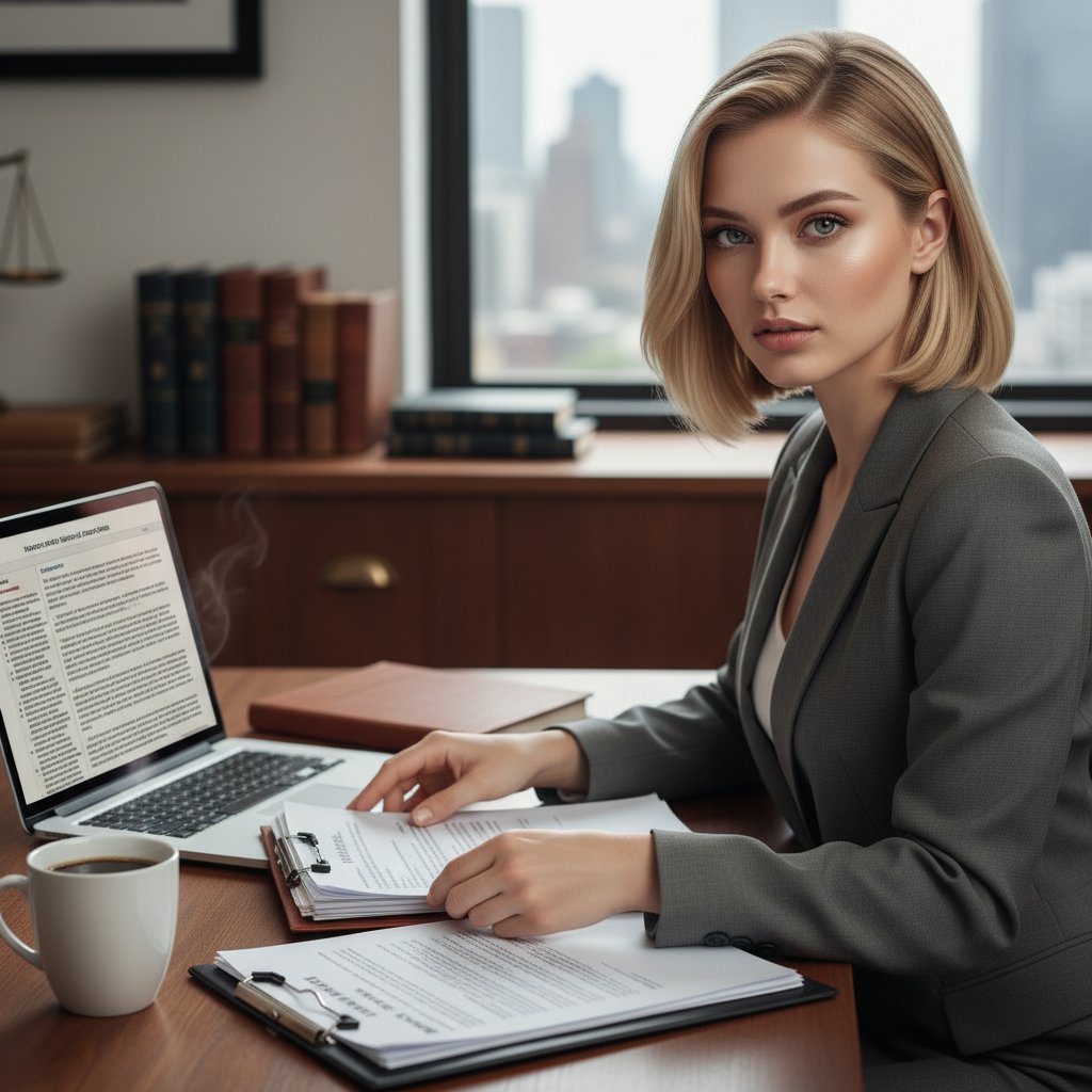 Крупный план: женщина-адвокат с короткой стрижкой, одетая в деловую юбку, сосредоточенно смотрит в камеру, перебирая документы за рабочим столом. Рядом с ней ноутбук и чашка кофе, создавая атмосферу деловой серьёзности.