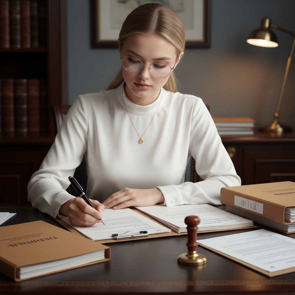 Женщина-адвокат в элегантной белой блузке и очках сосредоточенно подписывает бумаги за массивным столом. На столе разложены юридические папки и печать. Снято крупным планом, передавая атмосферу деловой ответственности и профессионализма.