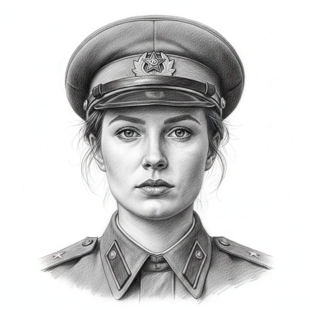 «Используй загруженное фото, сохрани внешность полностью. Реалистичный карандашный портрет женщины в военной форме времён Второй мировой войны, пилотка со звездой, серьёзный взгляд, лёгкие пряди волос на лице, детализированная штриховка, мягкий свет, графитовый рисунок, классический портрет, художественный стиль, белый фон, высокая детализация».