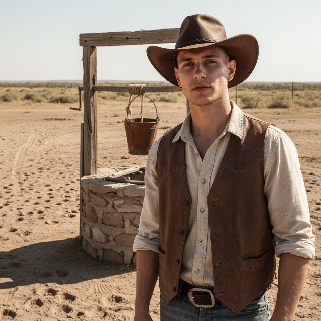 Мужчина в ковбойской шляпе и жилетке из кожи, стоит у ветхого колодца, прямой взгляд в объектив, вокруг видны следы от лошадей на пыльной земле