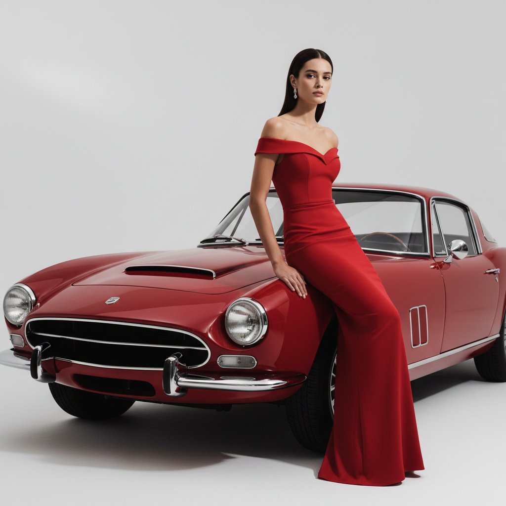 Создай портрет, не меняя черты лица. Фэшн-фотография модели рядом с ярко-красным винтажным спортивным автомобилем 1960-х годов с плавными обтекаемыми линиями и хромированными деталями. Она опирается на капот, создавая уверенную позу. На женщине элегантный наряд в красных тонах: приталенное платье с открытыми плечами и гладкой текстурой. Насыщенная монохромная палитра, минималистичный светлый студийный фон с мягкими тенями. Гиперреалистичный редакторский стиль высокой моды, 8k, высокая детализация металла, кожи и ткани. 9:16