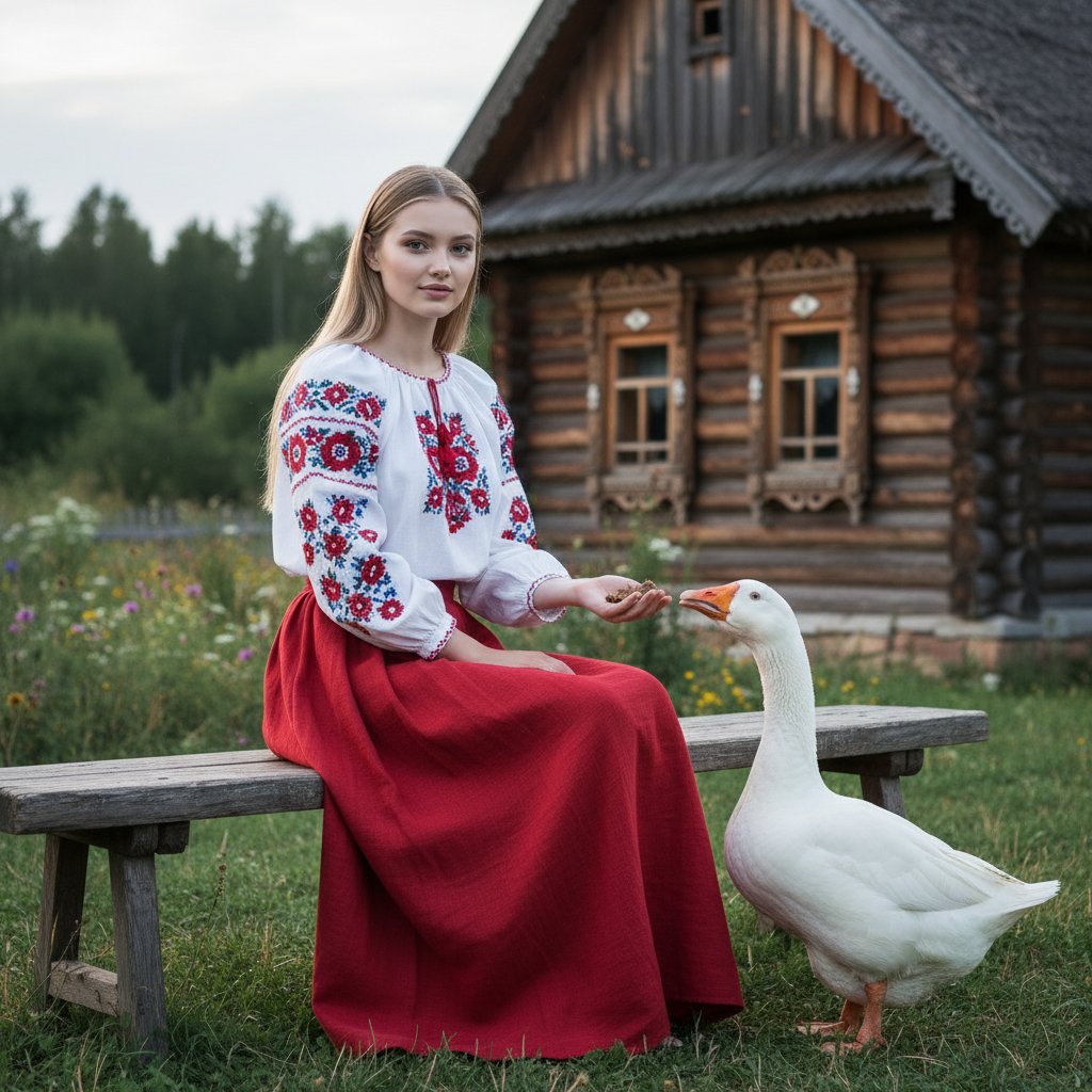 Молодая женщина в вышитой белой блузе и алой юбке сидит на скамье возле деревянной избы, угощая белого гуся. Взгляд направлен в объектив.