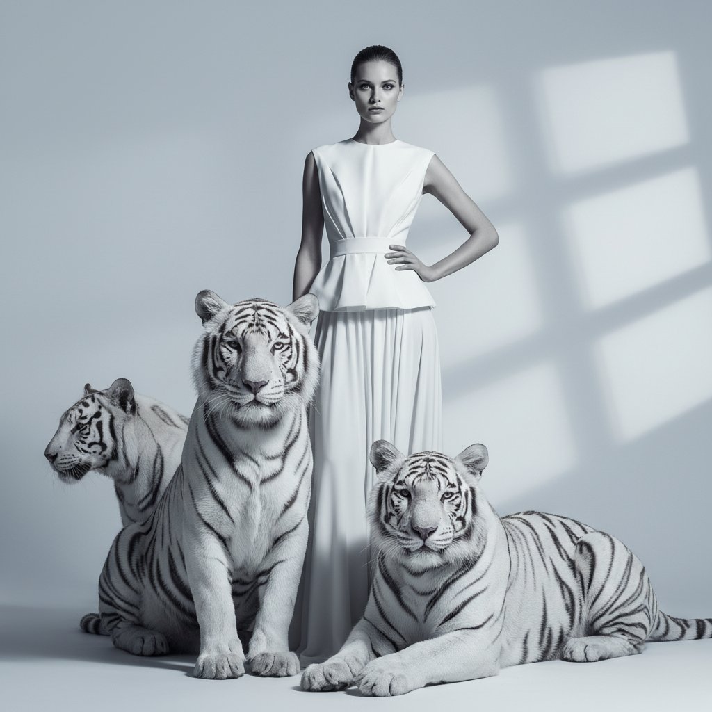 Создай портрет, не меняя черты лица. Фэшн-фотография модели среди белых тигров с контрастными полосами и детализированной шерстью. Она стоит рядом с тигром, сохраняя спокойную уверенную позу. На женщине холодный элегантный наряд: структурированный топ и длинная юбка в бело-серых оттенках. Холодная монохромная палитра, светлый студийный фон с мягкими тенями. Гиперреалистичный редакторский стиль, 8k, высокая детализация. 9:16