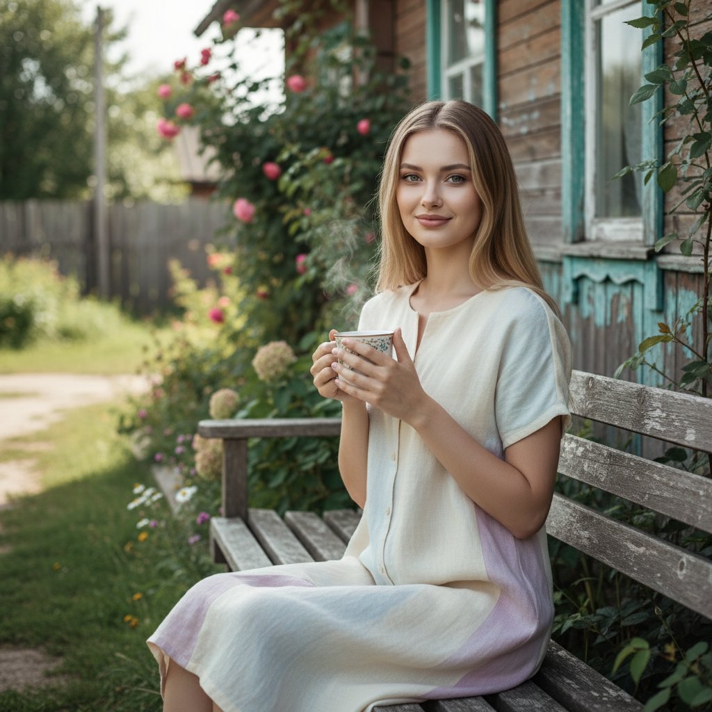 Женщина в светлом льняном платье пастельных оттенков расположилась на деревянной лавочке возле старого дачного домика. Она бережно держит в обеих руках чашку с чаем, её взгляд направлен в объектив, а на лице играет нежная улыбка. Атмосфера уюта и безмятежности летнего утра за городом.