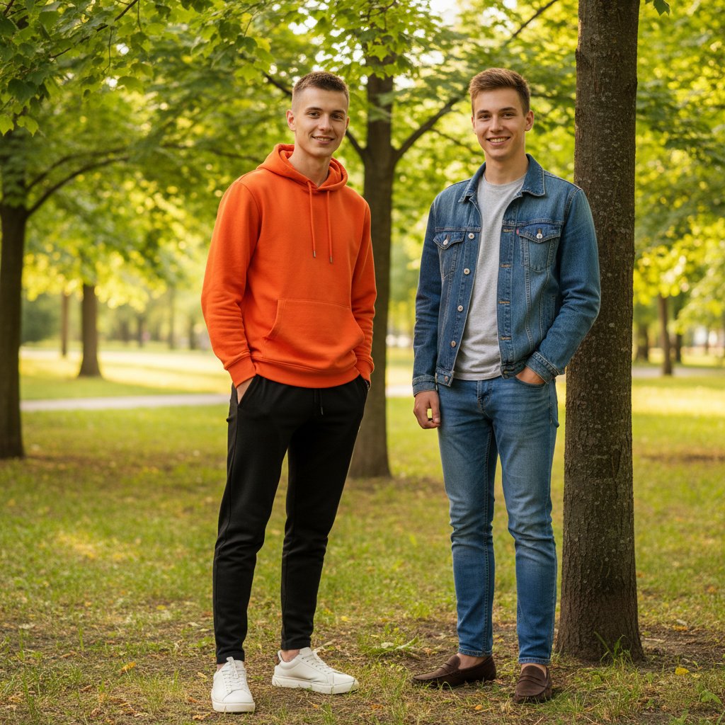 Двое парней-подростков позируют на камеру в летнем парке среди деревьев. Один одет в оранжевую толстовку, чёрные спортивные штаны и белые кроссовки. Второй — в синей джинсовой куртке поверх светло-серой футболки, классических джинсах и тёмных мокасинах. Лёгкая улыбка, расслабленные позы, летнее освещение.