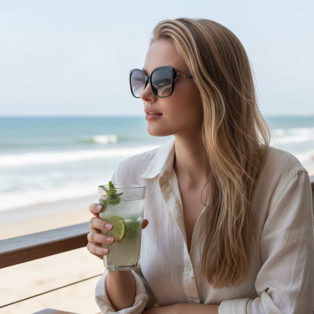 Девушка в светлой льняной рубашке и темных очках расположилась в прибрежном кафе. В руке у нее бокал освежающего напитка. Взгляд направлен вдаль, она ощущает легкое дуновение морского бриза. На заднем плане видны приближающиеся к берегу волны. Съемка крупным планом, передающая атмосферу безмятежного отпуска.