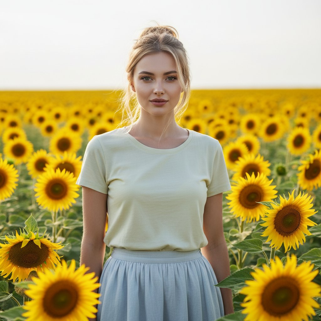 Молодая женщина в легкой льняной юбке и футболке пастельных тонов позирует на фоне цветущего поля подсолнухов. Волосы уложены в свободный пучок, взгляд направлен в объектив, на губах — едва заметная улыбка. Мягкое естественное освещение подчеркивает летнюю атмосферу. Средний план, акцент на гармонии с природой.