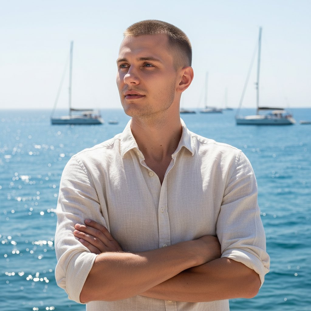 Мужчина в светлой льняной рубашке с подкатанными рукавами, руки скрещены на груди, взгляд устремлен вдаль. На заднем плане видны яхты и морская гладь, играющая солнечными бликами. Крупный план, передающий атмосферу стильного летнего отдыха.