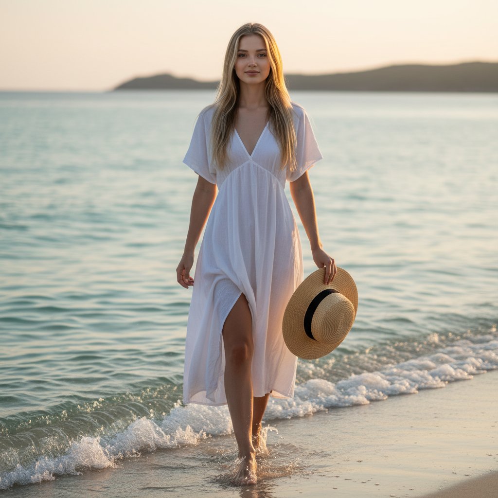 Девушка в струящемся белом платье из хлопка прогуливается по кромке воды, демонстрируя загорелую кожу. В руке она держит плетеную шляпу, взгляд направлен в объектив с легкой улыбкой. Морские волны нежно омывают ее ноги. Кадр крупным планом, передающий атмосферу безмятежного летнего отпуска и ощущение прохлады.