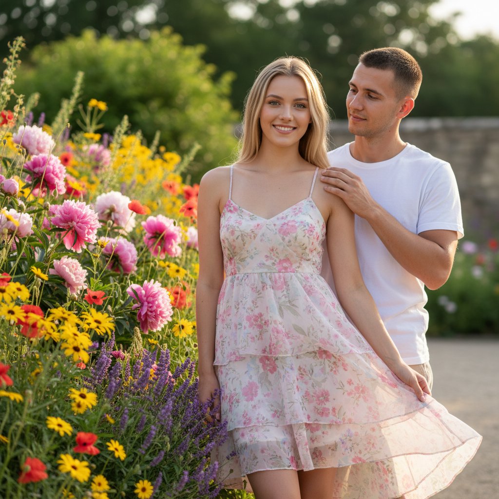 Девушка в воздушном летнем наряде позирует у яркой клумбы. Её спутник находится позади, его рука нежно касается её плеча, но всё внимание сосредоточено на ней. Она смотрит прямо в объектив, её улыбка полна искренности. Освещение и ракурс подчёркивают её природную красоту и обаяние.