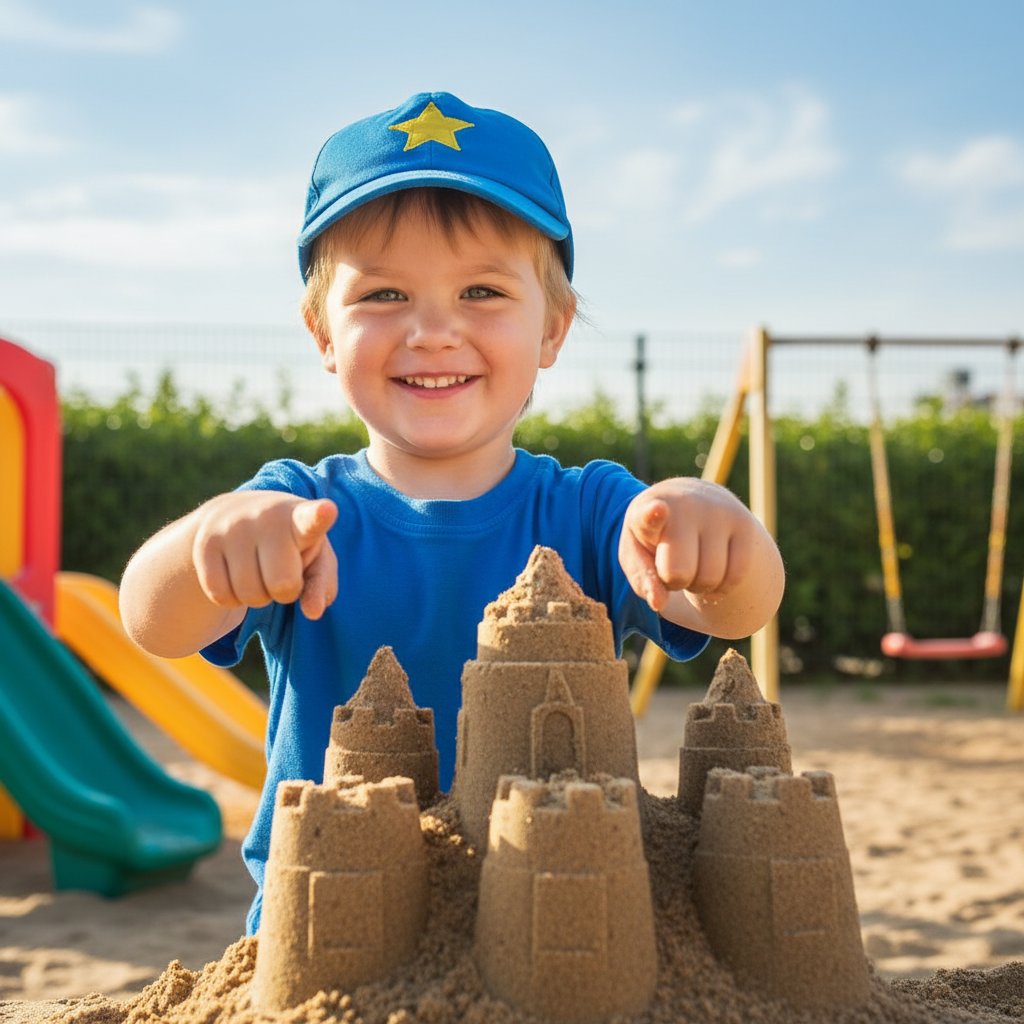 Ребенок в кепке и футболке стоит на игровой площадке, с гордостью показывая песочный замок. Он радостно смотрит в объектив, широко улыбаясь. Снято крупным планом, передает летнее настроение детской беззаботности и счастья.
