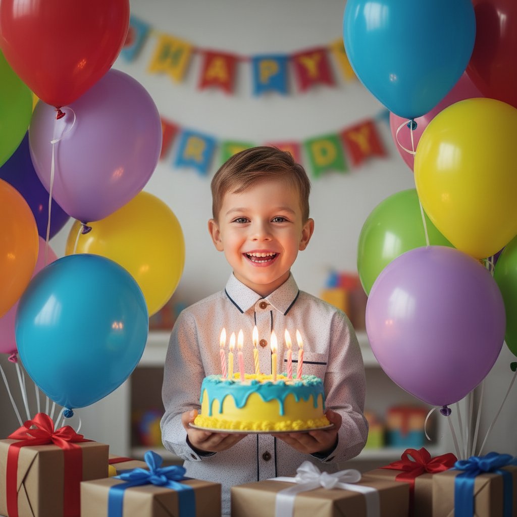 Мальчик в нарядной рубашке, окруженный воздушными шарами и подарками, держит праздничный торт с горящими свечами и радостно улыбается в камеру. Освещение яркое, дневное.