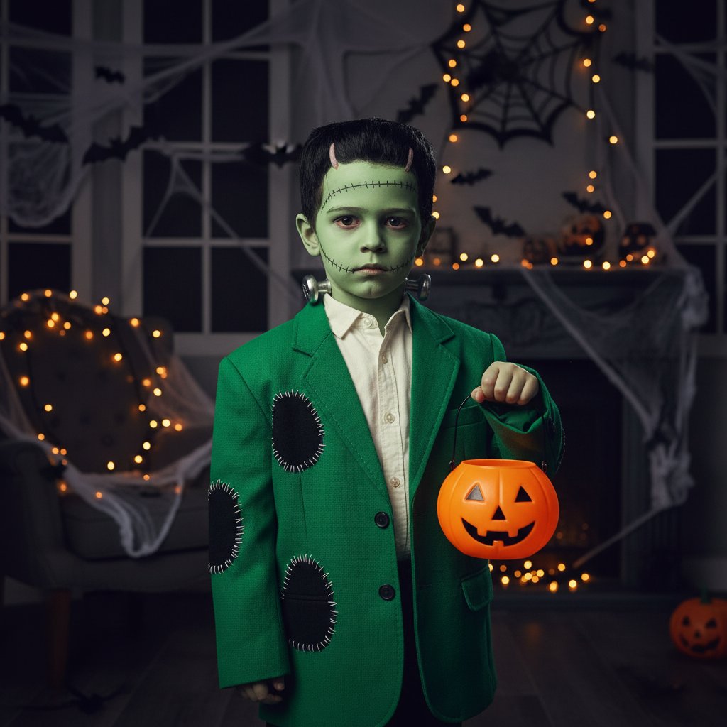 Ребёнок в образе Франкенштейна в затемнённой комнате, украшенной паутиной и гирляндами в виде летучих мышей. На нём зелёный пиджак с чёрными нашивками, светлая рубашка и бутафорские болты на шее. В руке он держит маленький фонарик в форме тыквы. Мальчик уверенно смотрит в объектив, освещённый мягким, мерцающим светом.