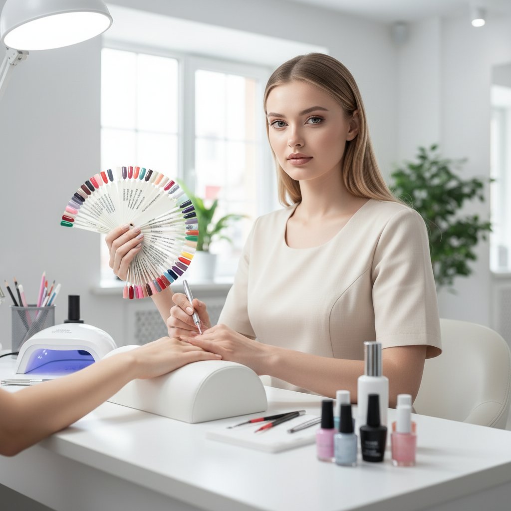 Фотография специалиста по маникюру, средний план, за рабочим столом. В одной руке она держит образец цветов лаков, а другой выполняет процедуру для клиента. Взгляд направлен в камеру, демонстрируя сосредоточенность. Окружение – светлое, современное помещение. Акцент на точности движений и уверенности мастера.
