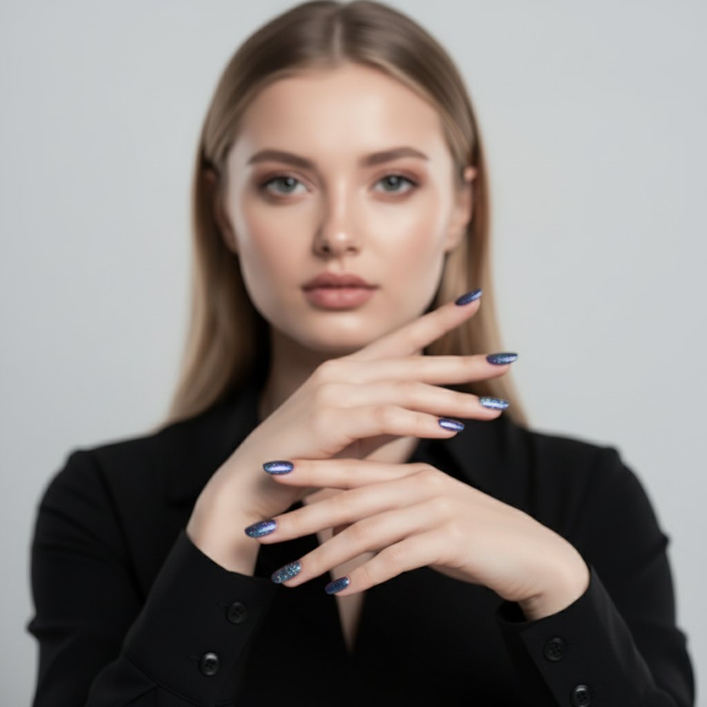 Портрет мастера маникюра в стильной черной блузе, снятый со средней дистанции. Женщина смотрит в объектив, ее лицо слегка не в фокусе. Руки с изящным маникюром в мерцающих синих и фиолетовых тонах обрамляют подбородок, акцентируя внимание на ногтях. Фон светлый и однородный.