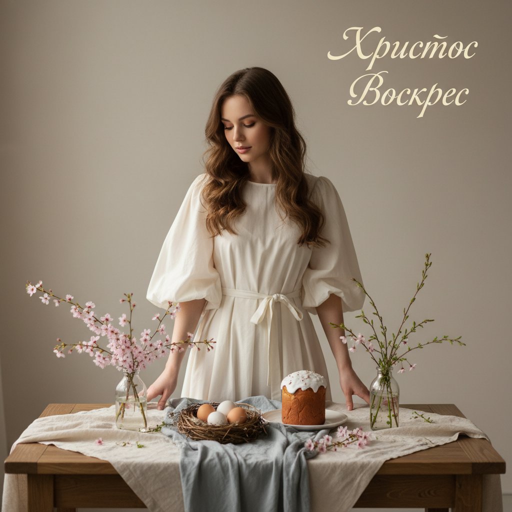Создай атмосферный пасхальный портрет молодой женщины в минималистичном светлом интерьере. Девушка с длинными мягкими волнистыми каштановыми волосами стоит у стола в воздушном кремово-белом платье с объемными рукавами и поясом. Она смотрит вниз с нежным спокойным выражением лица. На столе — пасхальный кулич с белой глазурью, гнездо с натуральными яйцами, стеклянные вазы с нежными розовыми цветами и веточками, мягкая голубовато-серая ткань, светлая текстурная скатерть. Атмосфера утонченная, спокойная, эстетичная, весенняя и немного fine art. Мягкий естественный свет, минимализм, гармоничная композиция, editorial photography, photorealistic, highly detailed, soft shadows, warm neutral tones, 4k. Добавь элегантную каллиграфическую надпись: «Христос Воскрес».