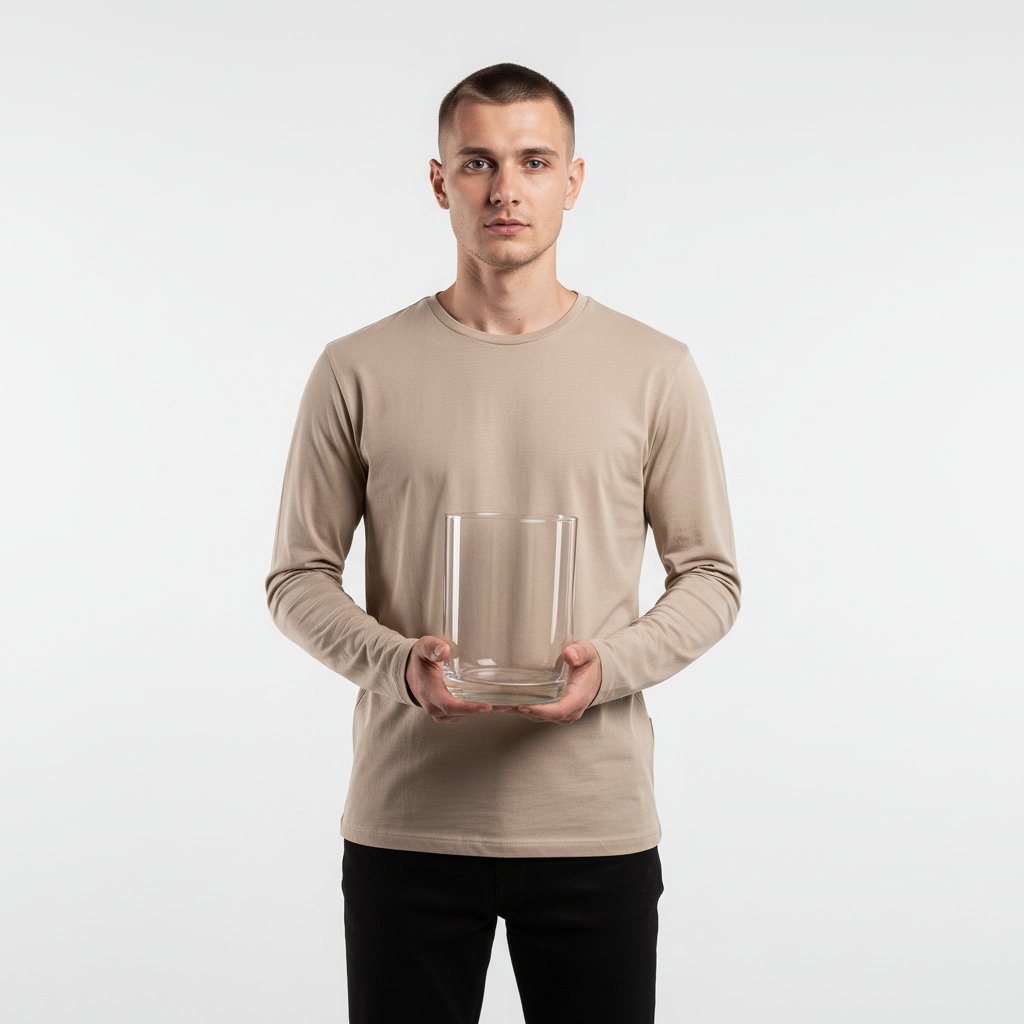 Молодой мужчина в бежевой футболке с длинным рукавом и черных брюках позирует на белой циклораме. Он смотрит прямо в объектив, держа в руках пустую прозрачную стеклянную вазу. Поза статичная, подчеркивающая атмосферу минимализма и сосредоточенности.