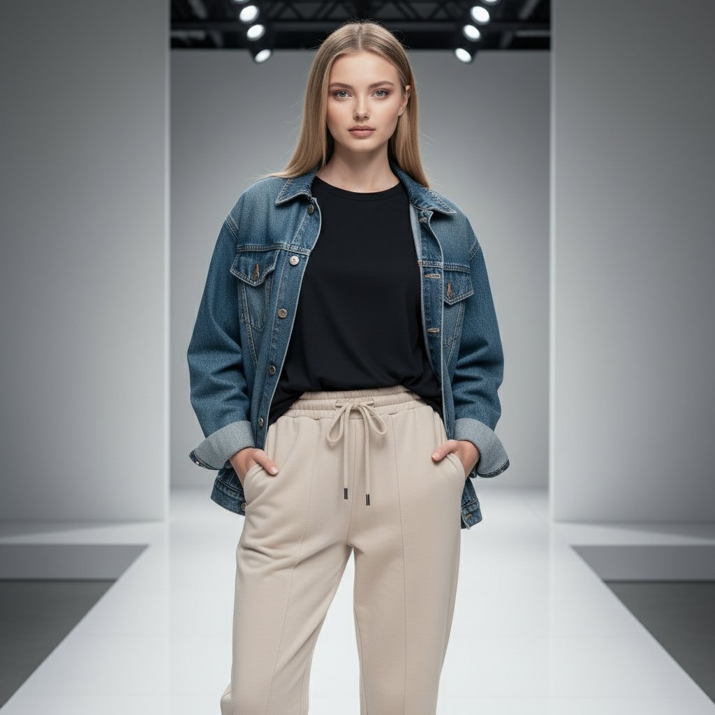 Девушка в центре внимания на подиуме. Одета в свободную черную футболку, заправленную в светло-бежевые брюки-джоггеры с поясом-шнурком, поверх накинута джинсовая куртка свободного кроя. Минималистичный фон и освещение. Взгляд направлен прямо в объектив. Средний план.
