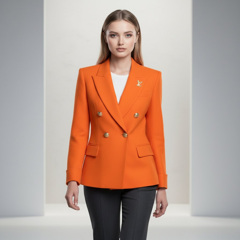 Женщина-модель на подиуме демонстрирует элегантный наряд от Louis Vuitton. Яркий оранжевый двубортный жакет с акцентными пуговицами, белый топ и прямые темные брюки. Минималистичный фон, мягкое освещение, средний план, взгляд направлен в камеру.