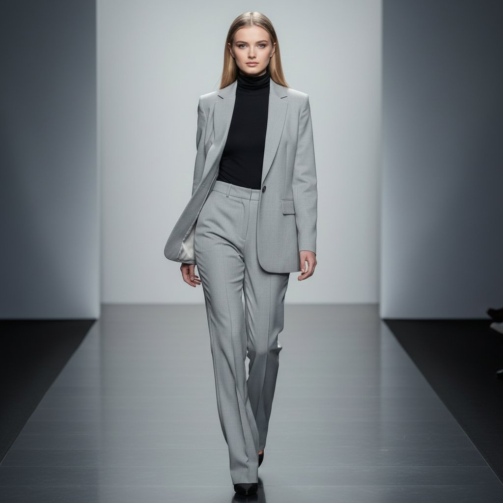 Девушка-модель шествует по подиуму в элегантном светло-сером брючном костюме. Образ дополнен черной водолазкой под удлиненный однобортный пиджак. Фон минималистичный, освещение мягкое, снято со среднего плана, взгляд направлен в объектив.
