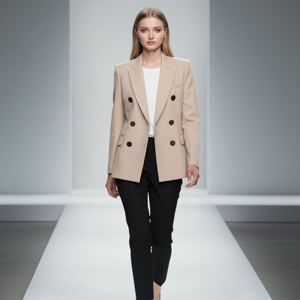 Женщина уверенно шагает по подиуму, демонстрируя образ от Celine: светло-бежевый двубортный жакет с акцентными пуговицами, укороченные черные брюки и белая футболка. Фон минималистичный, освещение мягкое студийное, кадр средний, взгляд прямой.