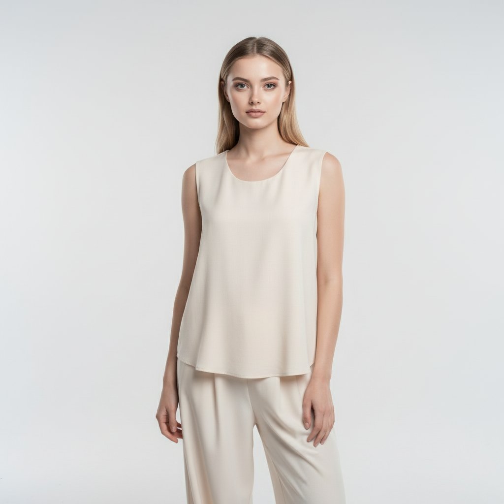 Девушка позирует в минималистичной студии на белоснежной циклораме. На ней светлый топ без рукавов и свободные брюки кремового цвета. Стоит расслабленно, руки свободно опущены. Средний план, взгляд уверенно направлен в камеру. Окружающее пространство чистое, освещение мягкое и равномерное студийное.