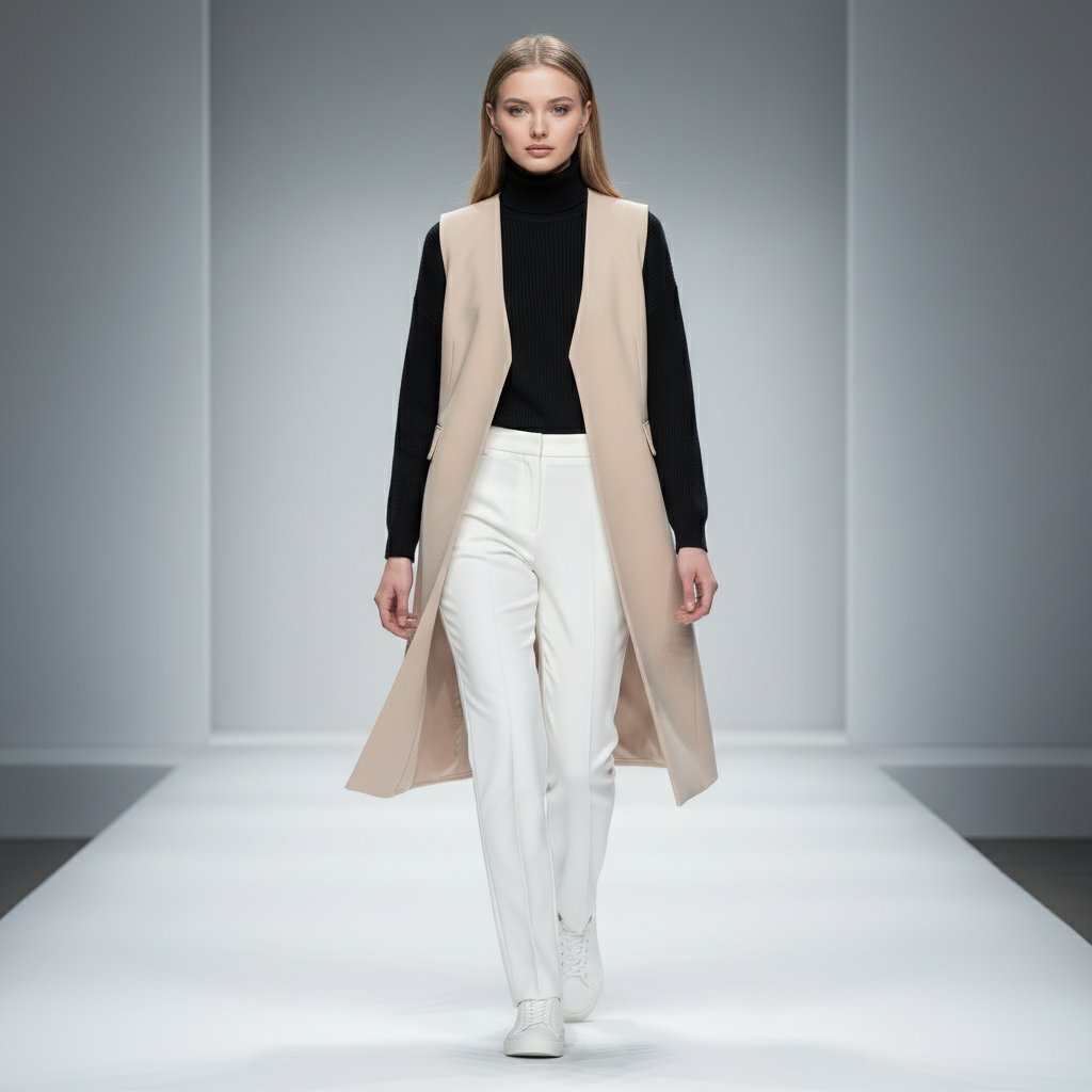 Женщина-модель демонстрирует образ на подиуме: удлиненная бежевая жилетка без рукавов поверх черной водолазки, дополненная прямыми брюками белого цвета. Взгляд направлен прямо в объектив. Съемка выполнена со среднего плана в минималистичном пространстве с нейтральным фоном и мягким естественным светом.