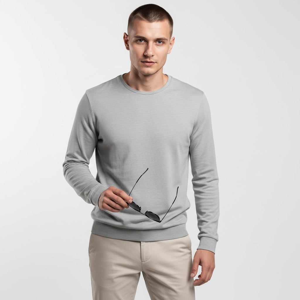 Современный молодой мужчина в однотонном свитере и светлых брюках стоит на белом фоне, слегка наклонившись вперед. В руке он держит лаконичные солнцезащитные очки. Взгляд направлен прямо в камеру, поза передает динамику, акцент сделан на чистых линиях и минималистичном стиле.