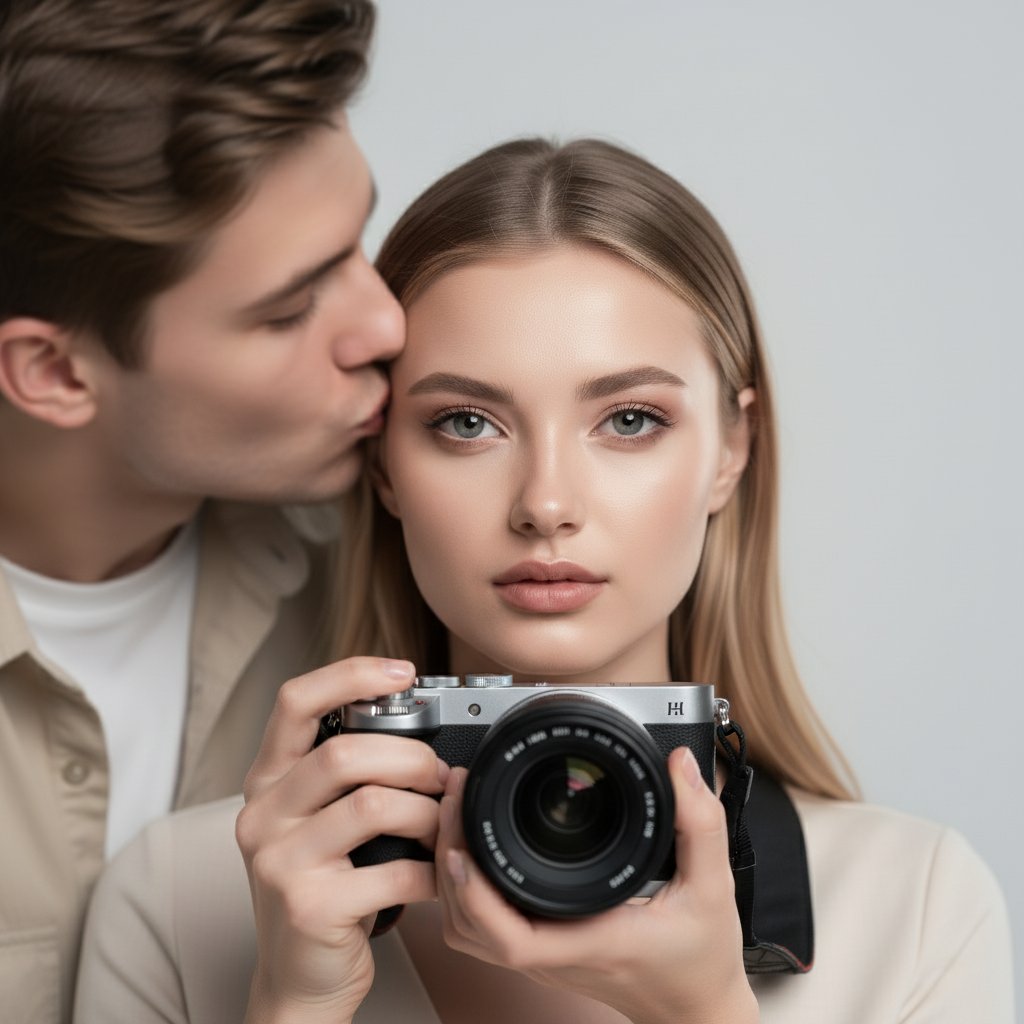 Женщина с камерой в руках, смотрящей на зрителя, получает нежный поцелуй в висок от своего парня. Она сосредоточена на процессе, он слегка размыт. Акцент на ней и творческом вдохновении.