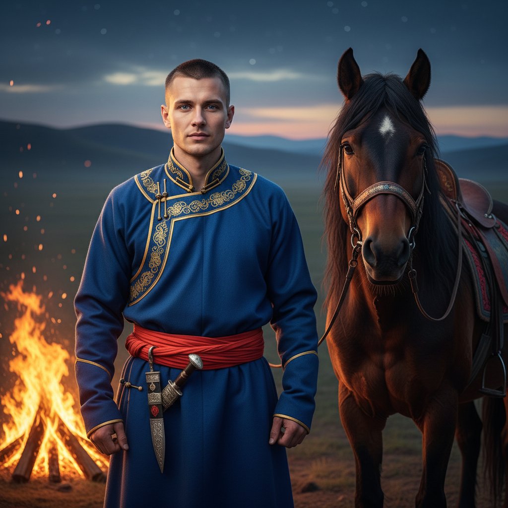 Мужчина в традиционном монгольском наряде, подпоясанный, с высоким воротником, позирует у пылающего костра. Рядом стоит его верный конь. Снято крупным планом, передавая атмосферу спокойствия и решимости.