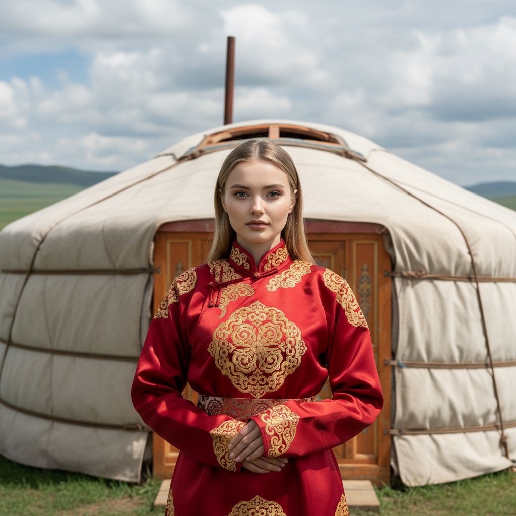 Портрет женщины в алом монгольском наряде с золотыми узорами, стоящей у входа в традиционную юрту. Руки скрещены на талии, взгляд направлен прямо в камеру. Крупный план, передающий атмосферу спокойствия и достоинства.